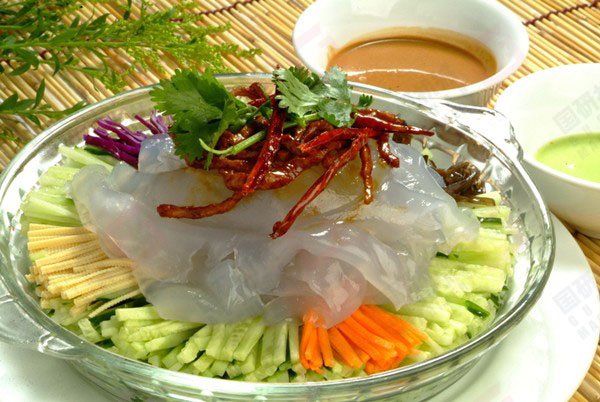 5.吃的時(shí)候?qū)⒗乃腥〕銮谐蓪挆l,放入備好的各種絲、炒好的肉絲和兌好的調(diào)料汁,再放入少許鹽拌勻就可以吃了,在飯店吃或者做宴客菜,就將所有的絲墊底,上面放拉皮,炒好的肉絲放到拉皮上,再澆上調(diào)料汁,吃的時(shí)候再拌勻就可以了