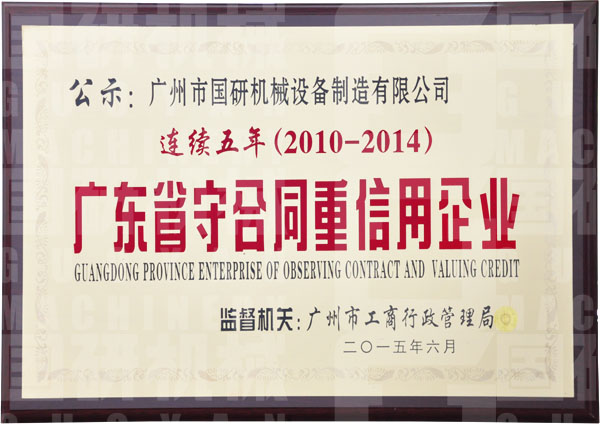“連續(xù)五年(2010-2014)廣東省守合同重信用企業(yè)”的牌匾在廣州市國研機械設備制造有限公司的文化展示墻上格外引人注目,這是對公司多年堅持誠信經(jīng)營的充分肯定,也是公司企業(yè)文化“誠信、創(chuàng)新、分享、精進”的客觀體現(xiàn)。