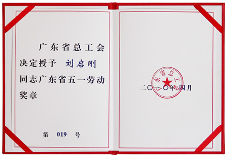 廣東省委、省政府授予劉啟剛同志廣東省五一勞動獎章證書