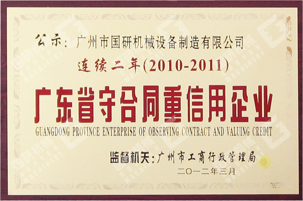 2012年3月,廣州市國研機械設備制造有限公司被評為2011年度“廣東省守合同重信用企業(yè)”。這是我司繼連續(xù)三年被評為“廣州市守合同重信用企業(yè)”之后,連續(xù)兩年獲此殊榮。