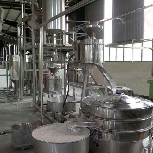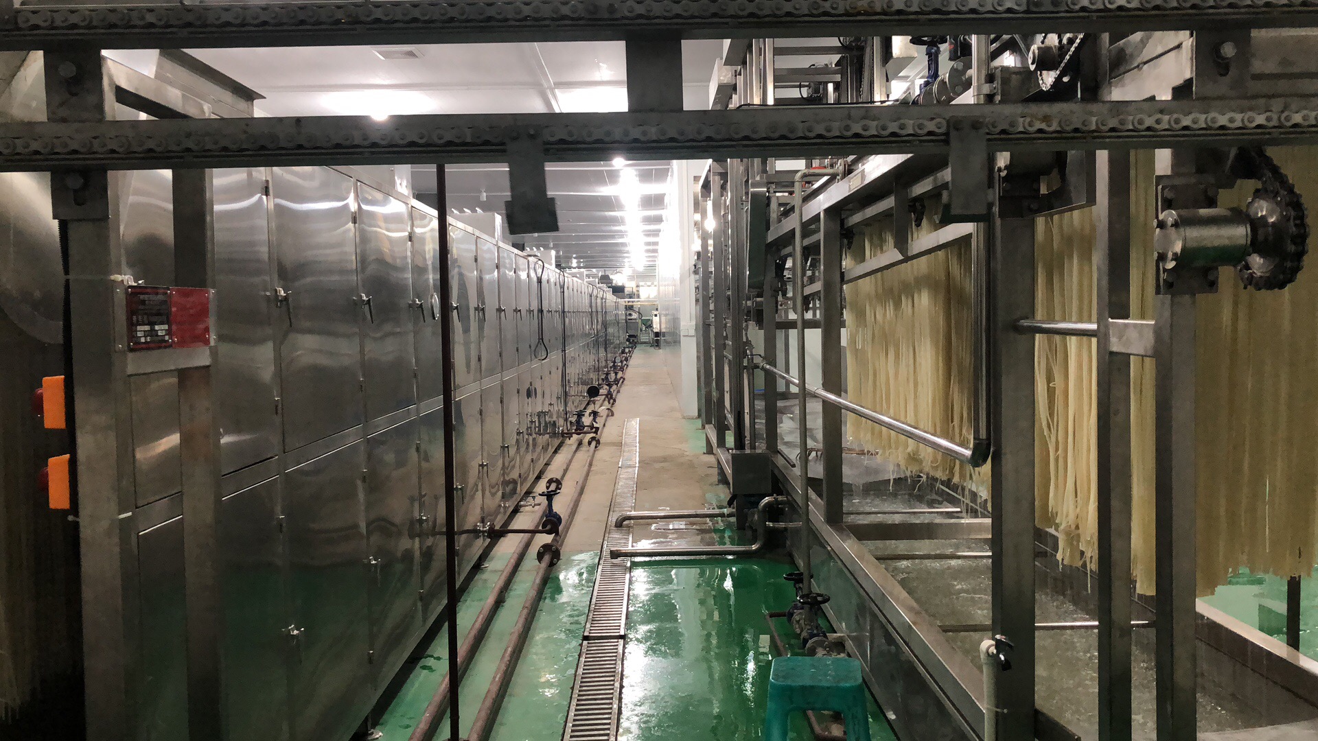 大米→提升→大米配送→泡米→射流輸送→清洗→除砂→米水分離→大米輸送→粉碎→旋風(fēng)分離→出料→儲(chǔ)料→提升→定量→加水?dāng)嚢琛鷥?chǔ)料輸送→提升→儲(chǔ)料喂料→自熟→擠絲→輸送→切斷掛桿→連續(xù)吊掛老化→轉(zhuǎn)桿→淋水→松絲→干燥→落桿→切斷→輸送→包裝→成品
